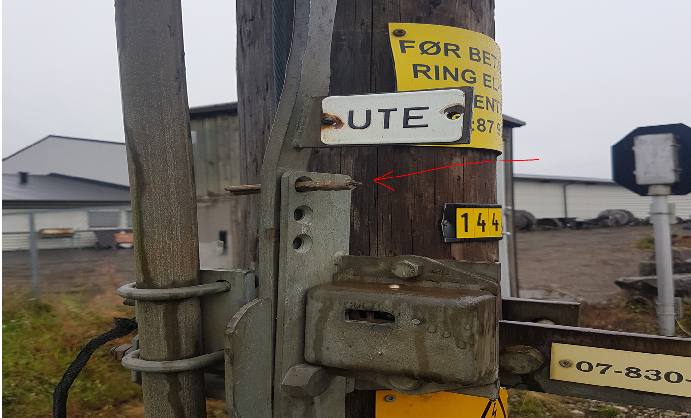 - Bryter 07-830-J låse i stilling «UTE» med egen lås (lås festes jf. rød pil på bilde). Nøkkel oppbevares av kontaktperson for avstengt område i periode mandag kl 07:00 til fredag kl 18:00.