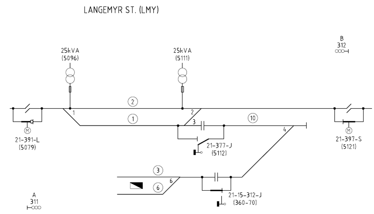 Eksisterende håndbetjent jordingsbryter 21-377-J har normal stilling «UT», og denne kobles «INN» når det skal kjøres med elektrisk lokomotiv inn/ ut i spor 3/ 6/ 10.