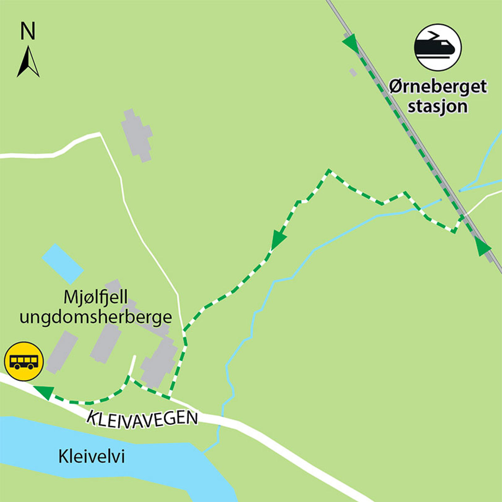Rail replacement service departs from bus stop Mjølfjell ungdomsherberge in Kleivavegen. Approximately walking distance, 450 meters.