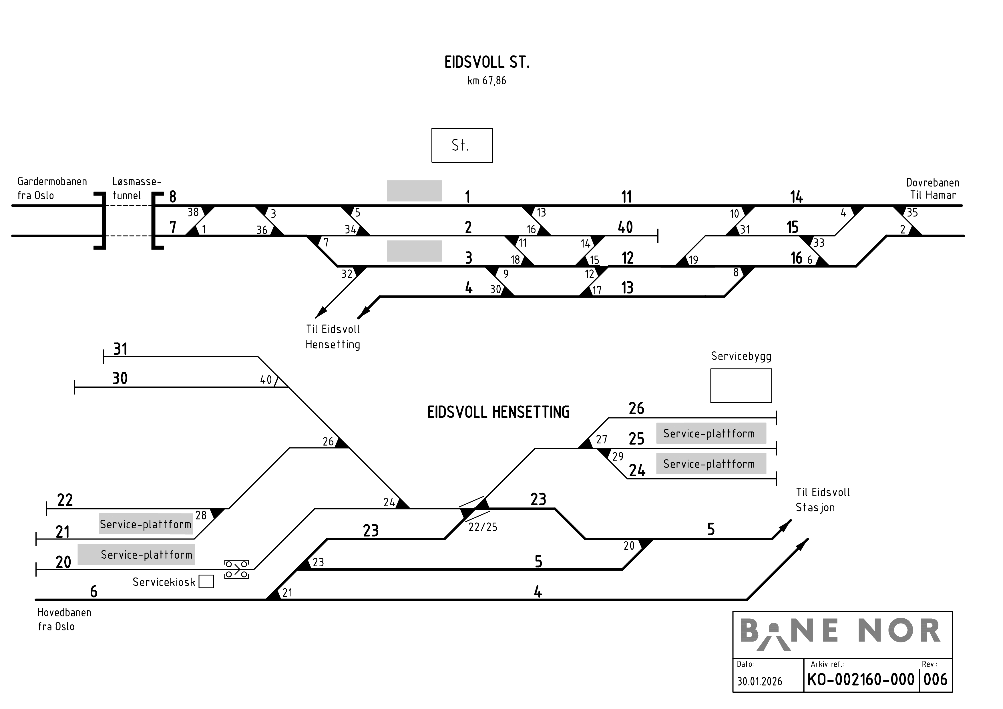 KL-anlegg | Serviceplattform | Sportilgang med bil | Toalettømming til stasjonært anlegg | Vannfylling | Togvarme | Tog-vaskemaskin | Dieselanlegg | Bremseluft | Merknader |