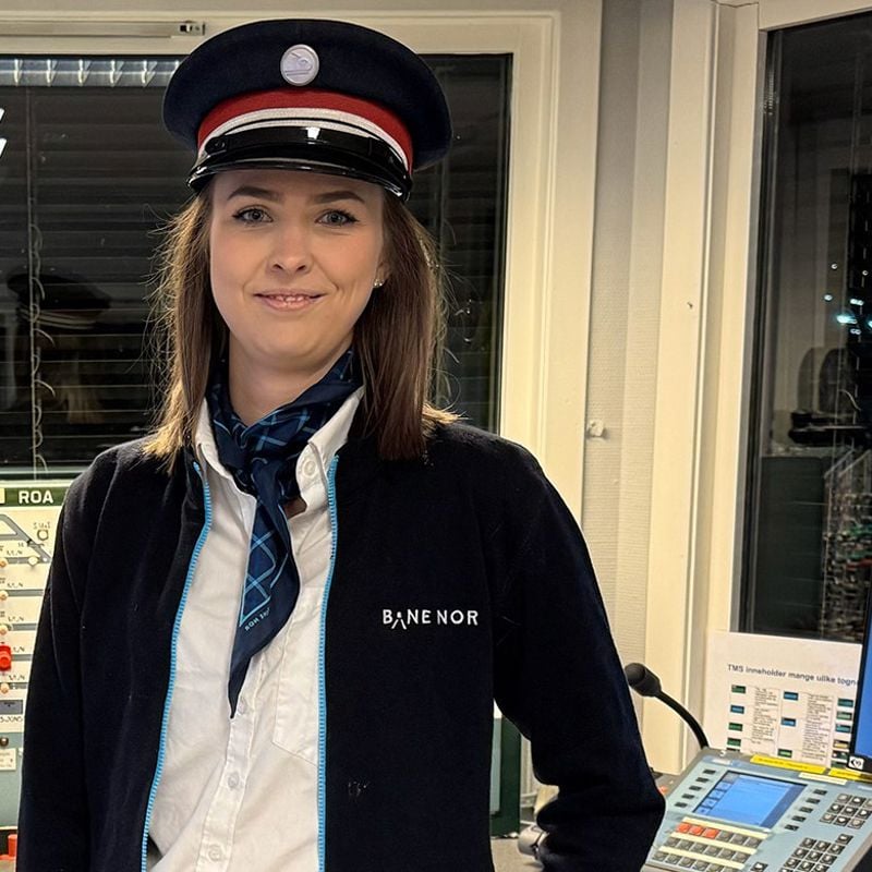 Cecilie jobber i trafikkstyringssentralen sentralt i Oslo, hvor hun bidrar til å gi tusenvis av reisende god informasjon når de reiser med tog.