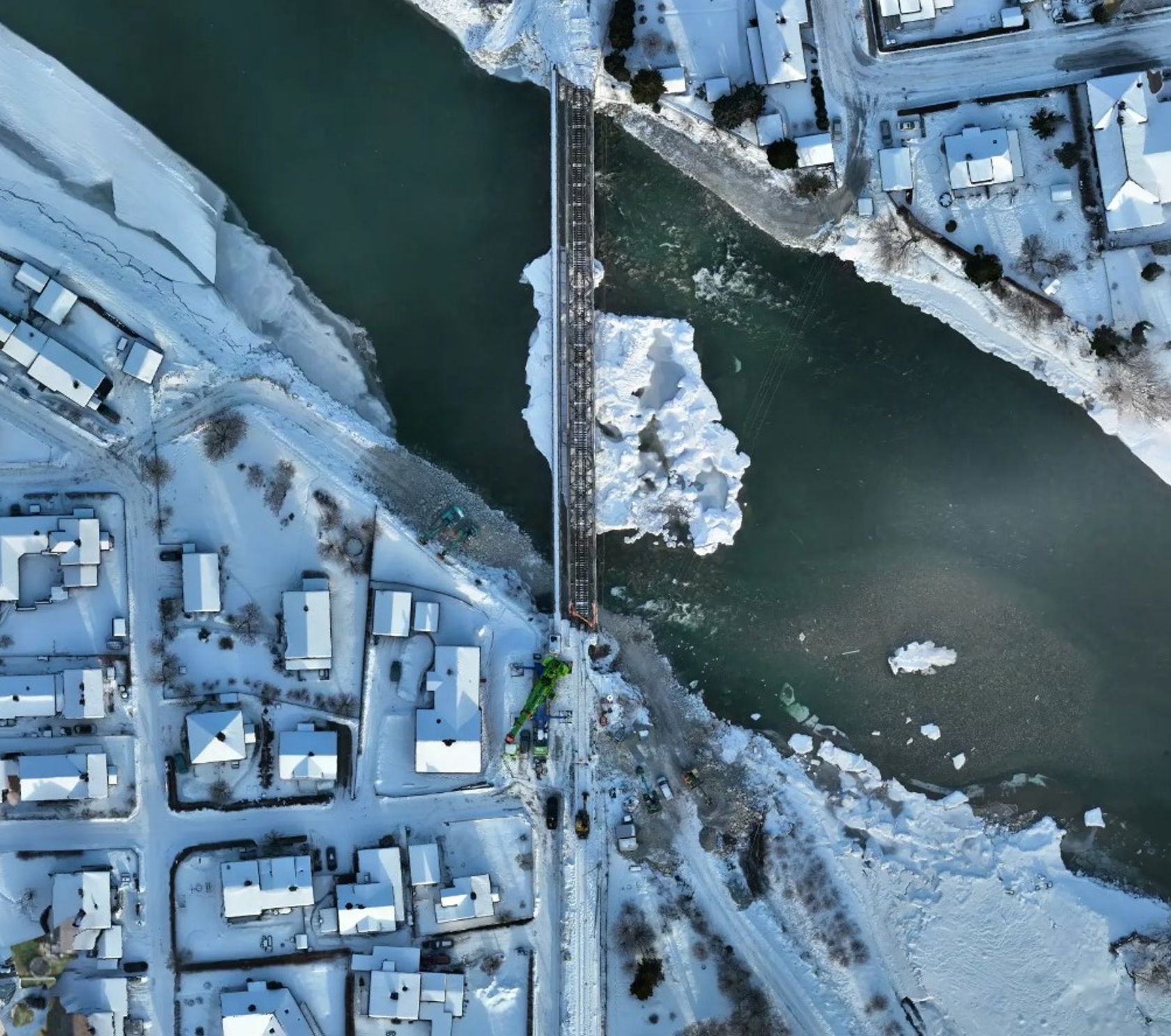23. jan. kl. 12.20: Arbeidet held fram med å fjerne is under brua. Dette arbeidet har god effekt, og vi har no fått ei stor opning på nordsida av elva. Vi er også i gang med å fylle på med stein oppstraums for å leie vatnet vekk frå landkaret.