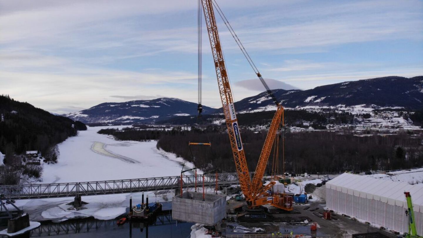 Måndag vart delar av det nye brufundamentet løfta ut i Gudbrandsdalslågen. Randklev bru er dermed eit viktig steg nærare opning.