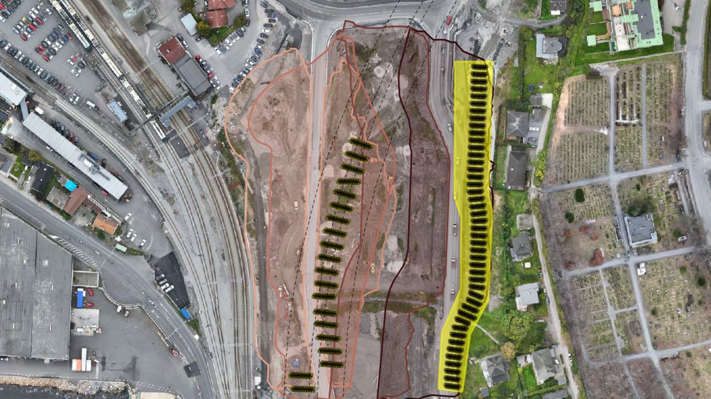 Bane NOR er nå i gang med å legge den midlertidige motfyllingen som strekker seg fra havneområdet og oppover mot Fjordveien.