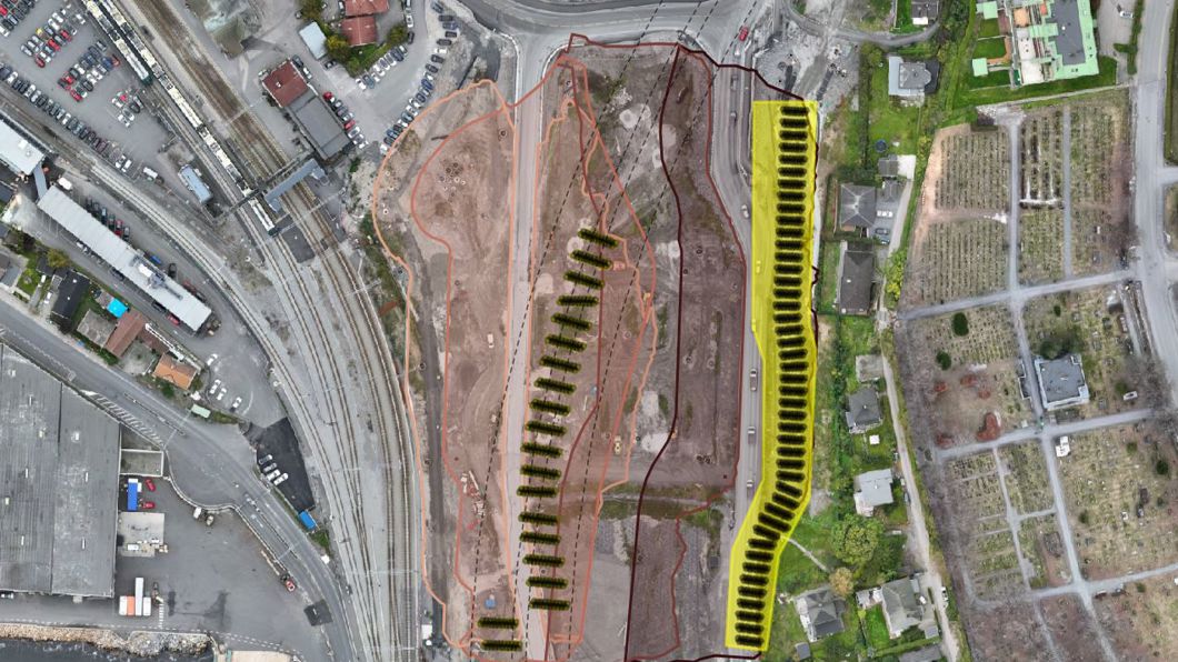 Bane NOR er nå i gang med å legge den midlertidige motfyllingen som strekker seg fra havneområdet og oppover mot Fjordveien.