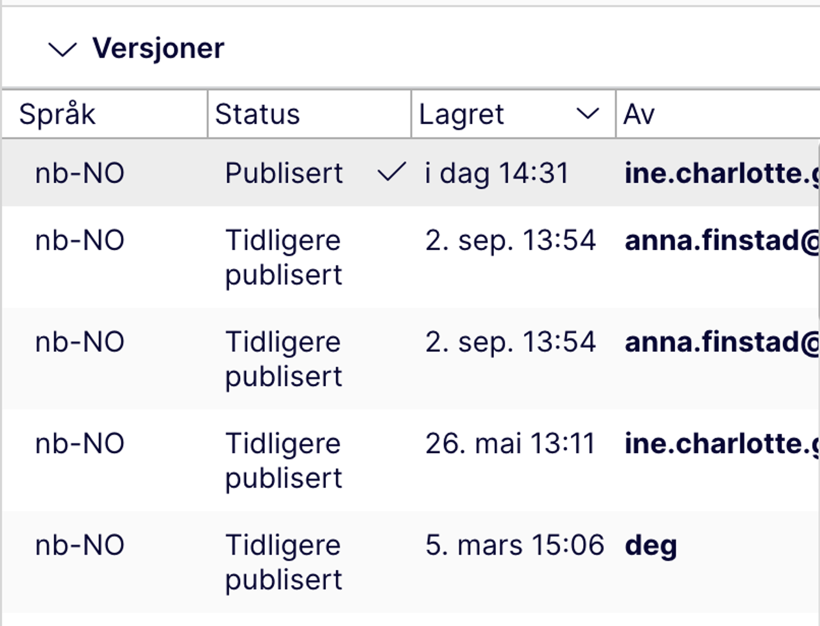 - Trykk på "Versjoner" i kolonnen "Navn"