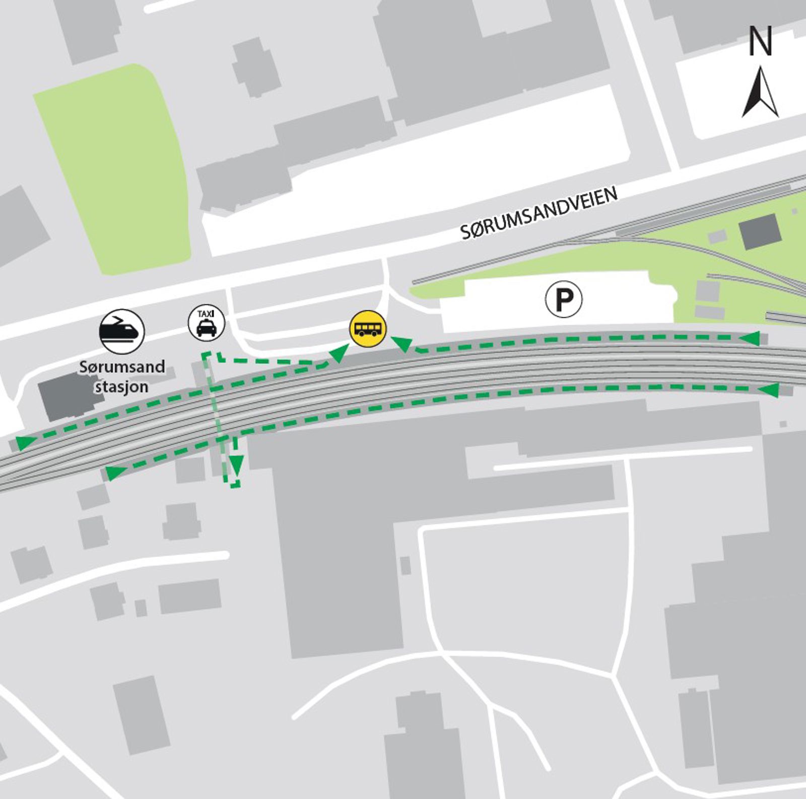 Bussene kjører fra bussholdeplassen Sørumsand stasjon plattform 1 (ved spor 1).
