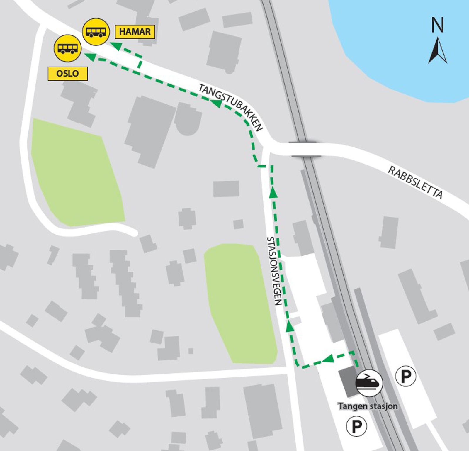 Bussene kjører retning Hamar og Oslo fra bussholdeplassene Tangen. Gangavstand til holdeplassene er ca. 300 meter.