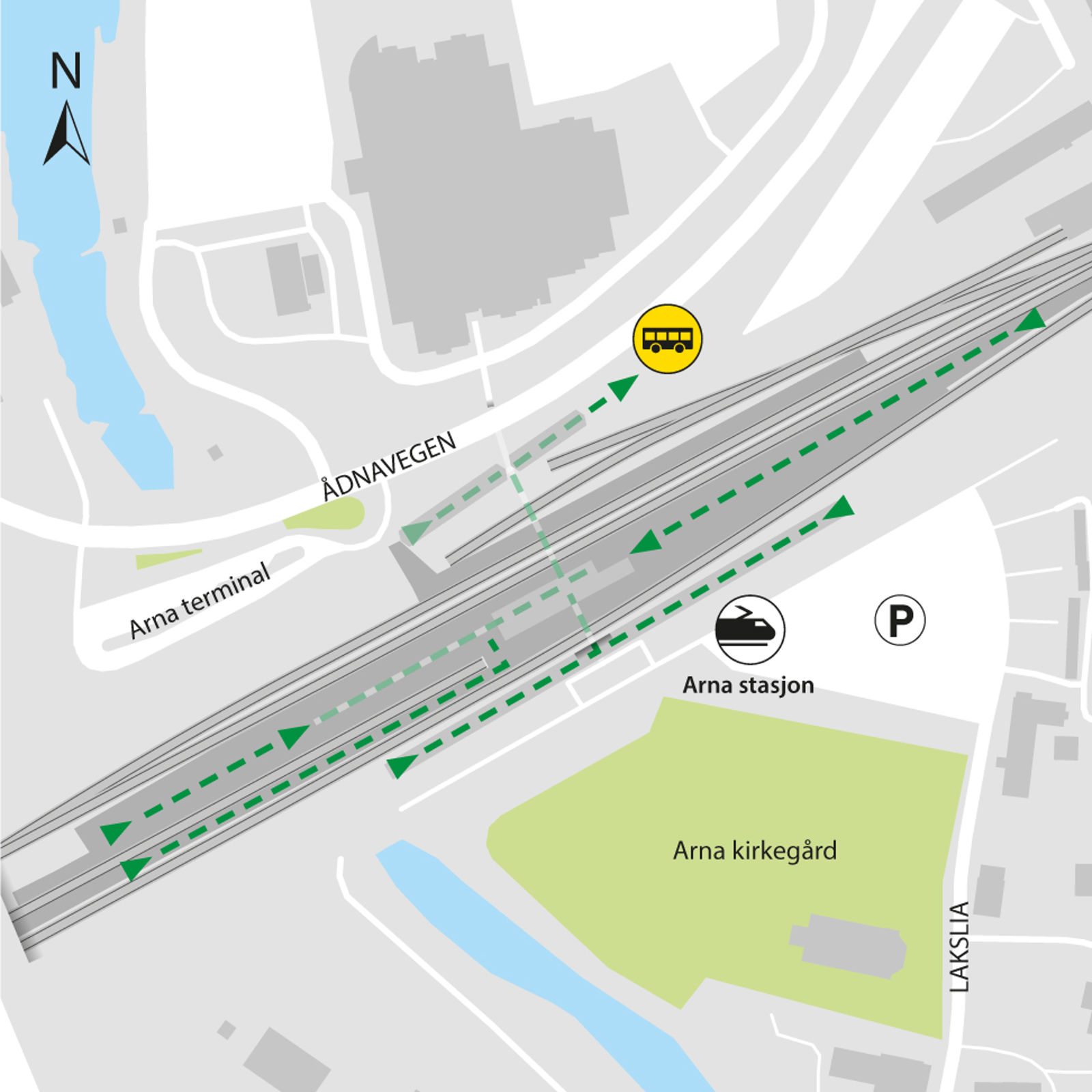 Bussterminal ved stasjonen. Undergang frå stasjon til bussterminal.