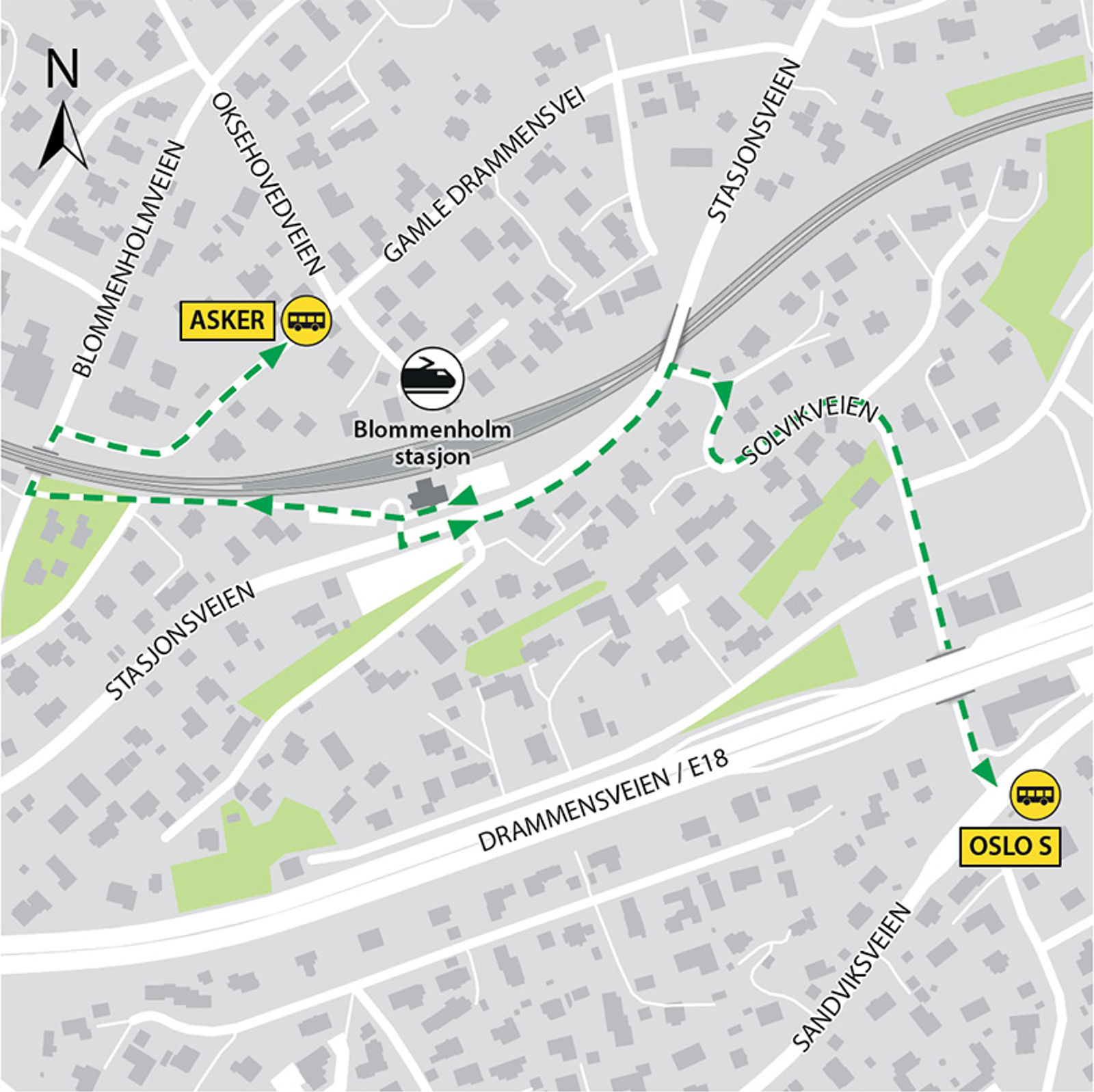 Ved avvik i togtrafikken settes det ikke opp egen alternativ transport. Benytt Ruters kollektivtilbud. Nærmeste Ruterholdeplasser er Milesten i Gamle Drammensvei (retning Asker) og Solvikveien i Sandviksveien (retning Oslo S). Gangavstand ca. 500-700 meter.