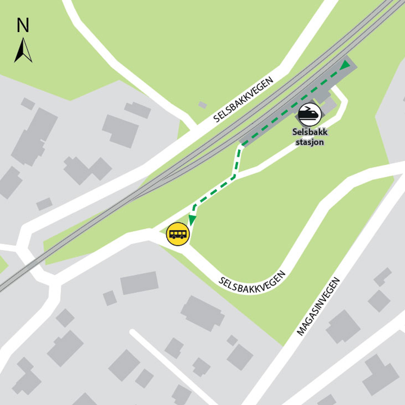 Bussene kjører fra bussholdeplassen Selsbakk stasjon. Gangavstand til holdeplassen er ca. 70 meter.