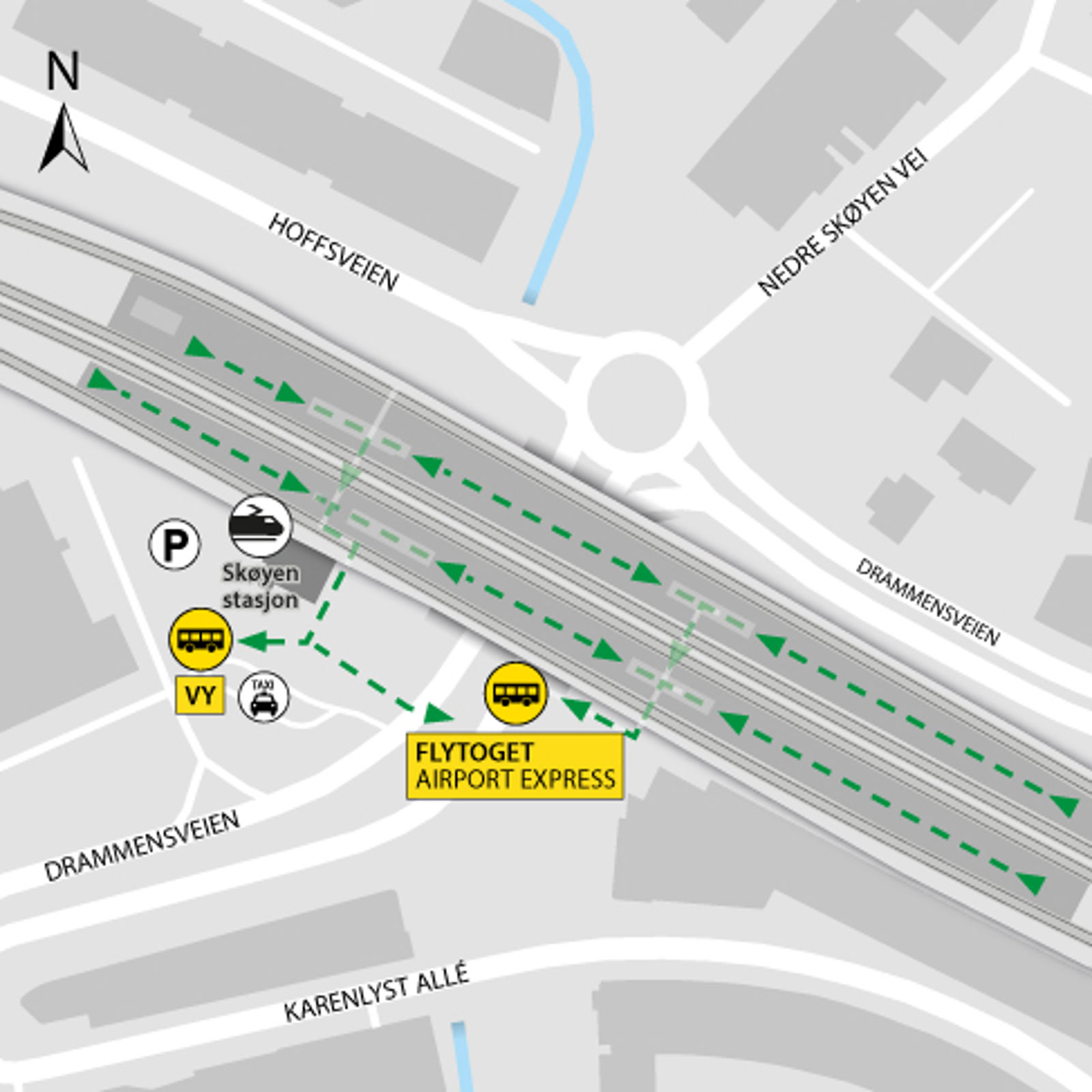 Bussene kjører fra holdeplassen ved stasjonsbygget (ved taxiholdeplassen). For reisende med Flytoget kjører det busser fra holdeplassen under broen i Drammensveien.