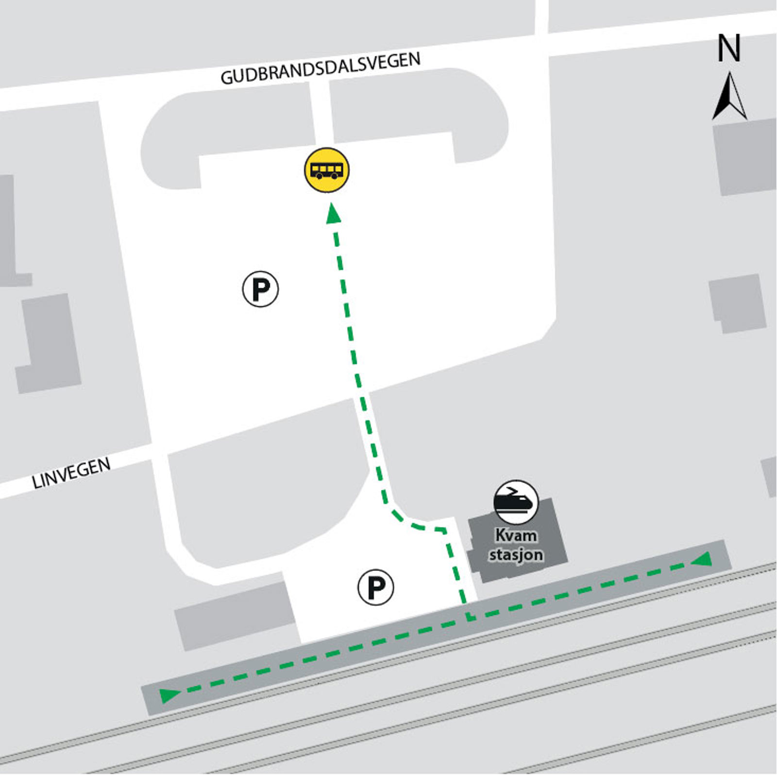 Bussene kjører fra bussholdeplassen Kvam stasjon. Gangavstand til holdeplassen er ca. 100 meter.
